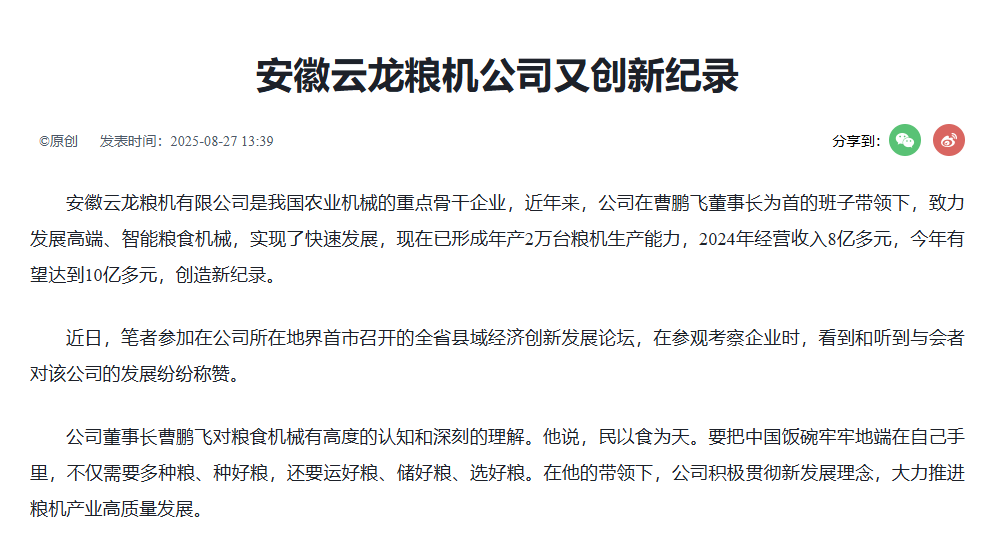 • 2025-08-29 中國工業(yè)新聞網(wǎng):安徽云龍糧機公司又創(chuàng)新紀錄